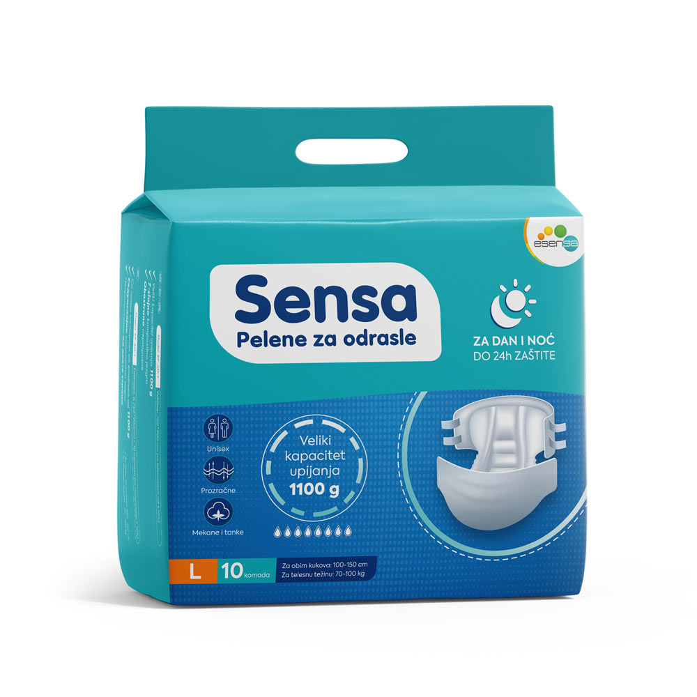 Sensa pelene za odrasle pružaju pouzdanu zaštitu i vrhunsku udobnost muškarcima i ženama koji pate od inkontinencije. Laboratorijski su ispitane i registrovane kao medicinsko sredstvo, što garantuje visoku efikasnost i sigurnost. Zahvaljujući višeslojnom kompozitnom jezgru, obezbeđuju izuzetnu apsorpciju, potpunu suvoću i zaštitu do 24 sata.